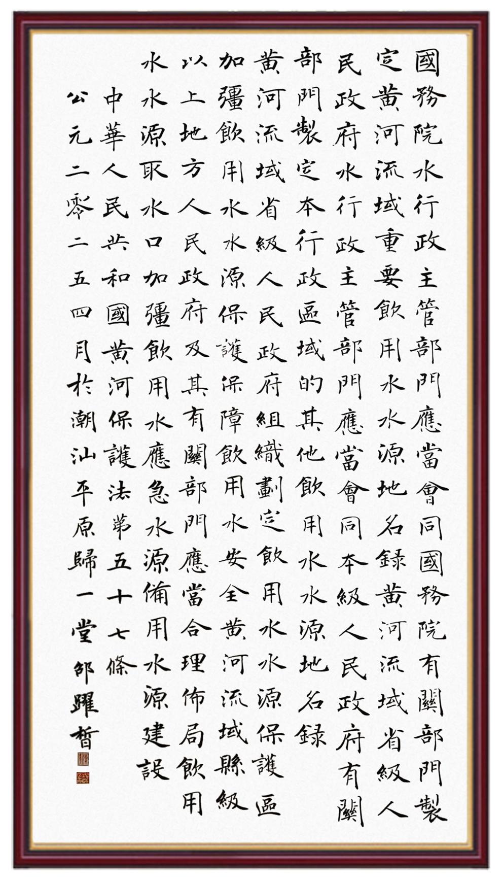 黃河寧,天下平。黃河是中華民族的發(fā)源地和搖籃,保護黃河是事關(guān)中華民族偉大復(fù)興的千秋大計?!吨腥A人民共和國黃河保護法》為推進水資源節(jié)約集約利用、保護傳承弘揚黃河文化、推動黃河流域生態(tài)保護和高質(zhì)量發(fā)展提供了有力法治保障。繼書寫《中華人民共和國民法典》《中華人民共和國憲法》《中華人民共和國澳門特別行政區(qū)基本法》《中華人民共和國香港特別行政區(qū)基本法》《中華人民共和國國旗法》《中華人民共和國國徽法》《中華人民共和國國歌法》《中華人民共和國法官法》等法律法規(guī)之后,法制日報社聯(lián)合沿黃九?。▍^(qū))司法廳、書法家協(xié)會,將筆端對準《中華人民共和國黃河保護法》。