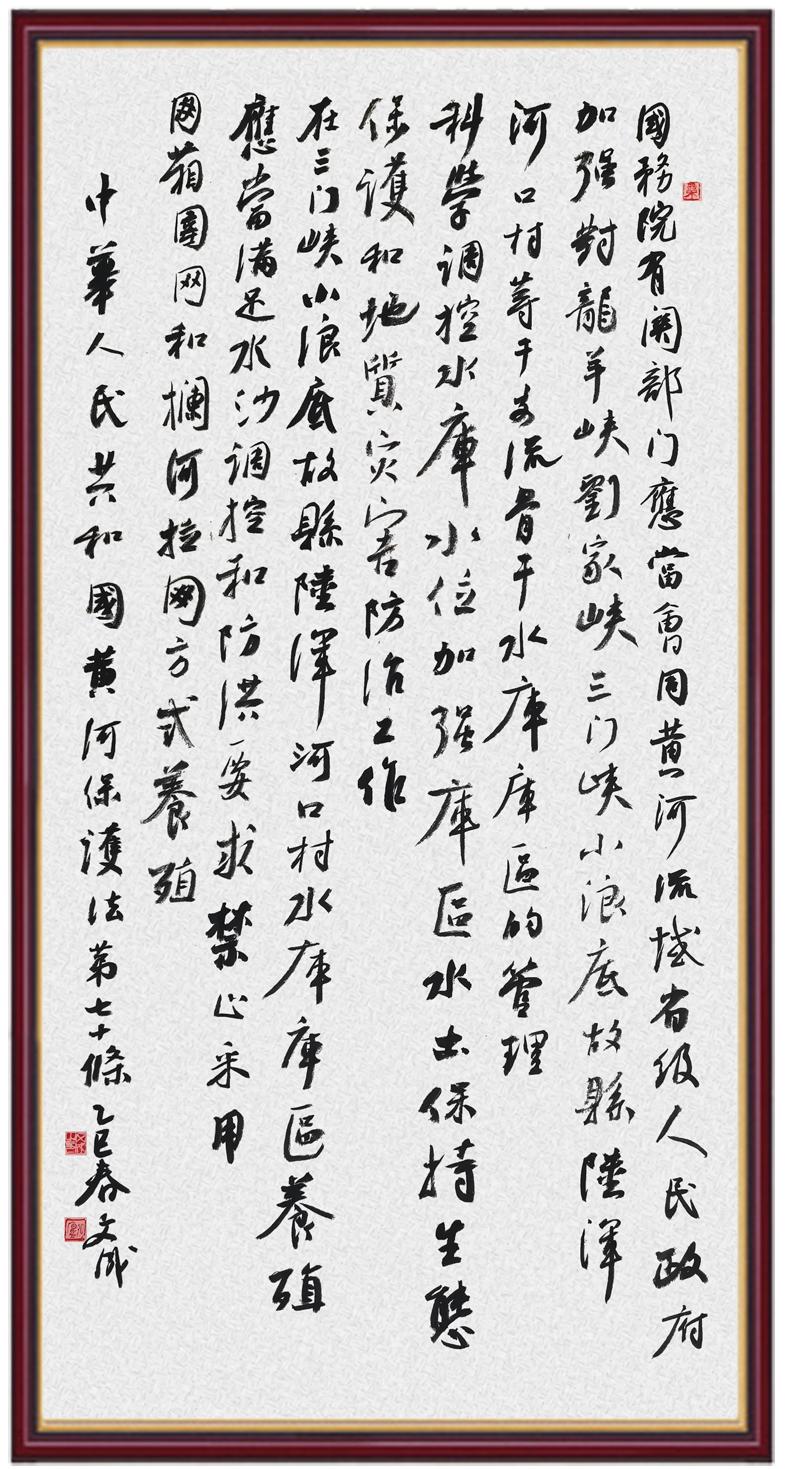 黃河寧,天下平。黃河是中華民族的發(fā)源地和搖籃,保護(hù)黃河是事關(guān)中華民族偉大復(fù)興的千秋大計(jì)?!吨腥A人民共和國黃河保護(hù)法》為推進(jìn)水資源節(jié)約集約利用、保護(hù)傳承弘揚(yáng)黃河文化、推動(dòng)黃河流域生態(tài)保護(hù)和高質(zhì)量發(fā)展提供了有力法治保障。繼書寫《中華人民共和國民法典》《中華人民共和國憲法》《中華人民共和國澳門特別行政區(qū)基本法》《中華人民共和國香港特別行政區(qū)基本法》《中華人民共和國國旗法》《中華人民共和國國徽法》《中華人民共和國國歌法》《中華人民共和國法官法》等法律法規(guī)之后,法制日報(bào)社聯(lián)合沿黃九省(區(qū))司法廳、書法家協(xié)會(huì),將筆端對準(zhǔn)《中華人民共和國黃河保護(hù)法》。