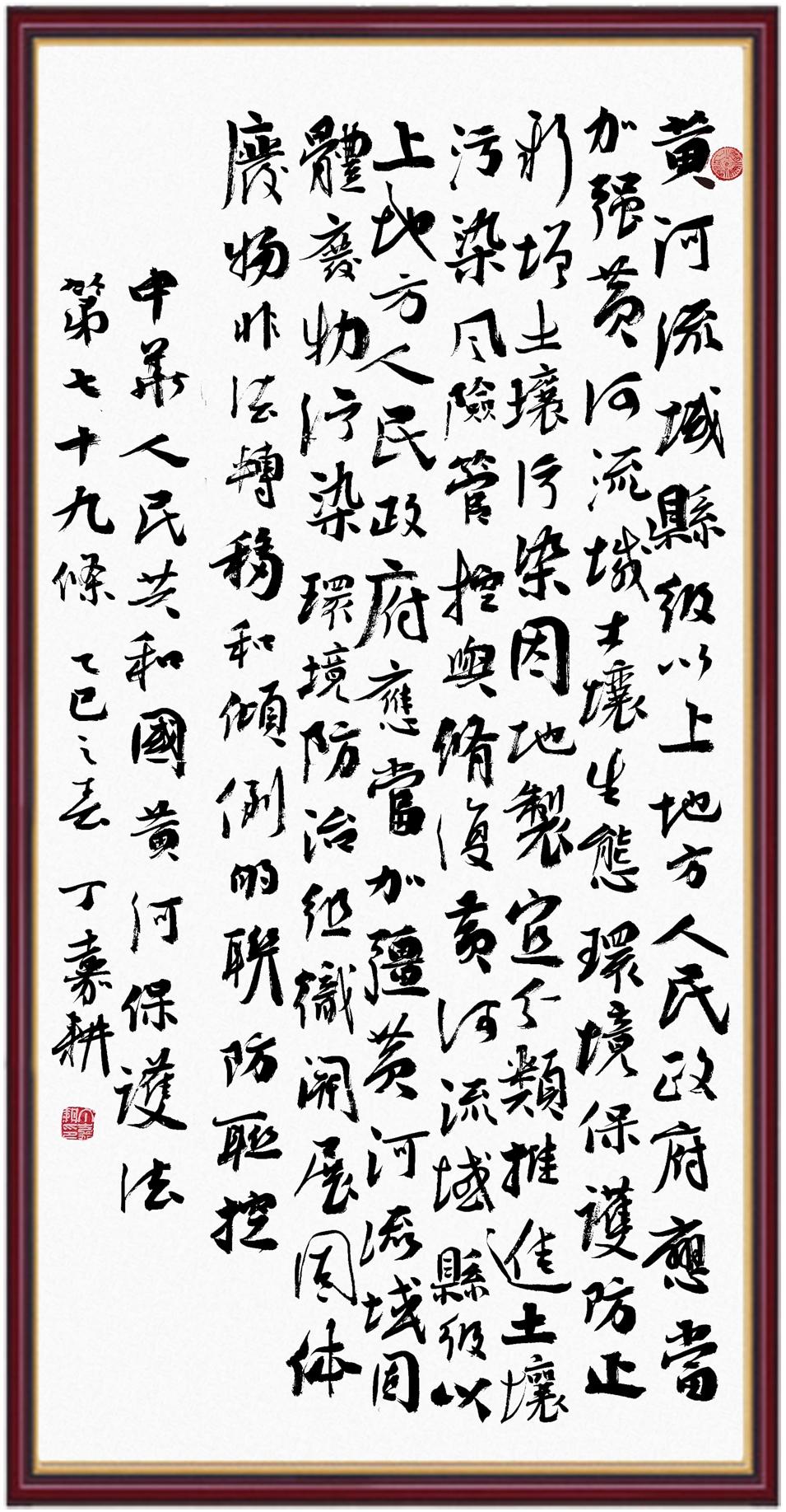 黃河寧,天下平。黃河是中華民族的發(fā)源地和搖籃,保護(hù)黃河是事關(guān)中華民族偉大復(fù)興的千秋大計(jì)?!吨腥A人民共和國(guó)黃河保護(hù)法》為推進(jìn)水資源節(jié)約集約利用、保護(hù)傳承弘揚(yáng)黃河文化、推動(dòng)黃河流域生態(tài)保護(hù)和高質(zhì)量發(fā)展提供了有力法治保障。繼書(shū)寫(xiě)《中華人民共和國(guó)民法典》《中華人民共和國(guó)憲法》《中華人民共和國(guó)澳門(mén)特別行政區(qū)基本法》《中華人民共和國(guó)香港特別行政區(qū)基本法》《中華人民共和國(guó)國(guó)旗法》《中華人民共和國(guó)國(guó)徽法》《中華人民共和國(guó)國(guó)歌法》《中華人民共和國(guó)法官法》等法律法規(guī)之后,法制日?qǐng)?bào)社聯(lián)合沿黃九省(區(qū))司法廳、書(shū)法家協(xié)會(huì),將筆端對(duì)準(zhǔn)《中華人民共和國(guó)黃河保護(hù)法》。