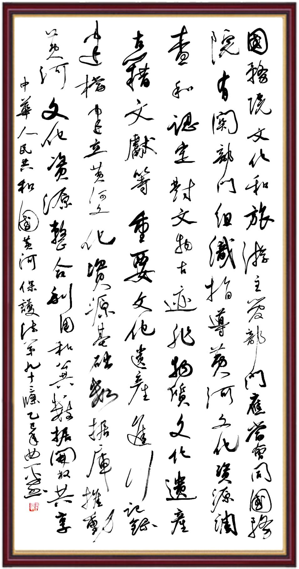 黃河寧,天下平。黃河是中華民族的發(fā)源地和搖籃,保護(hù)黃河是事關(guān)中華民族偉大復(fù)興的千秋大計(jì)。《中華人民共和國黃河保護(hù)法》為推進(jìn)水資源節(jié)約集約利用、保護(hù)傳承弘揚(yáng)黃河文化、推動(dòng)黃河流域生態(tài)保護(hù)和高質(zhì)量發(fā)展提供了有力法治保障。繼書寫《中華人民共和國民法典》《中華人民共和國憲法》《中華人民共和國澳門特別行政區(qū)基本法》《中華人民共和國香港特別行政區(qū)基本法》《中華人民共和國國旗法》《中華人民共和國國徽法》《中華人民共和國國歌法》《中華人民共和國法官法》等法律法規(guī)之后,法制日?qǐng)?bào)社聯(lián)合沿黃九?。▍^(qū))司法廳、書法家協(xié)會(huì),將筆端對(duì)準(zhǔn)《中華人民共和國黃河保護(hù)法》。