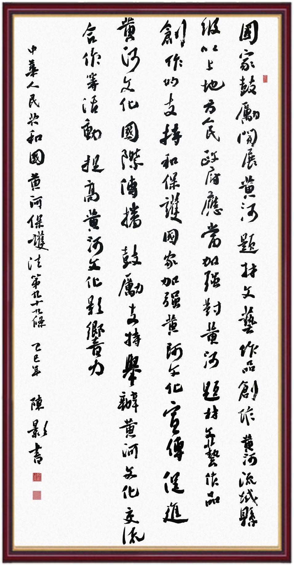 黃河寧,天下平。黃河是中華民族的發(fā)源地和搖籃,保護(hù)黃河是事關(guān)中華民族偉大復(fù)興的千秋大計(jì)?!吨腥A人民共和國黃河保護(hù)法》為推進(jìn)水資源節(jié)約集約利用、保護(hù)傳承弘揚(yáng)黃河文化、推動(dòng)黃河流域生態(tài)保護(hù)和高質(zhì)量發(fā)展提供了有力法治保障。繼書寫《中華人民共和國民法典》《中華人民共和國憲法》《中華人民共和國澳門特別行政區(qū)基本法》《中華人民共和國香港特別行政區(qū)基本法》《中華人民共和國國旗法》《中華人民共和國國徽法》《中華人民共和國國歌法》《中華人民共和國法官法》等法律法規(guī)之后,法制日?qǐng)?bào)社聯(lián)合沿黃九省(區(qū))司法廳、書法家協(xié)會(huì),將筆端對(duì)準(zhǔn)《中華人民共和國黃河保護(hù)法》。
