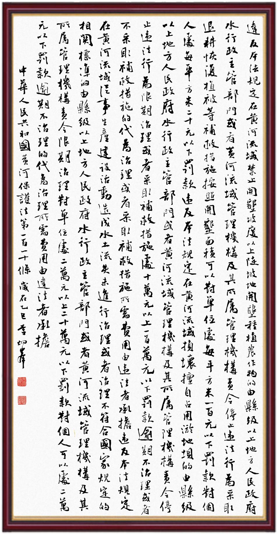 黃河寧,天下平。黃河是中華民族的發(fā)源地和搖籃,保護黃河是事關(guān)中華民族偉大復(fù)興的千秋大計?!吨腥A人民共和國黃河保護法》為推進水資源節(jié)約集約利用、保護傳承弘揚黃河文化、推動黃河流域生態(tài)保護和高質(zhì)量發(fā)展提供了有力法治保障。繼書寫《中華人民共和國民法典》《中華人民共和國憲法》《中華人民共和國澳門特別行政區(qū)基本法》《中華人民共和國香港特別行政區(qū)基本法》《中華人民共和國國旗法》《中華人民共和國國徽法》《中華人民共和國國歌法》《中華人民共和國法官法》等法律法規(guī)之后,法制日報社聯(lián)合沿黃九?。▍^(qū))司法廳、書法家協(xié)會,將筆端對準(zhǔn)《中華人民共和國黃河保護法》。