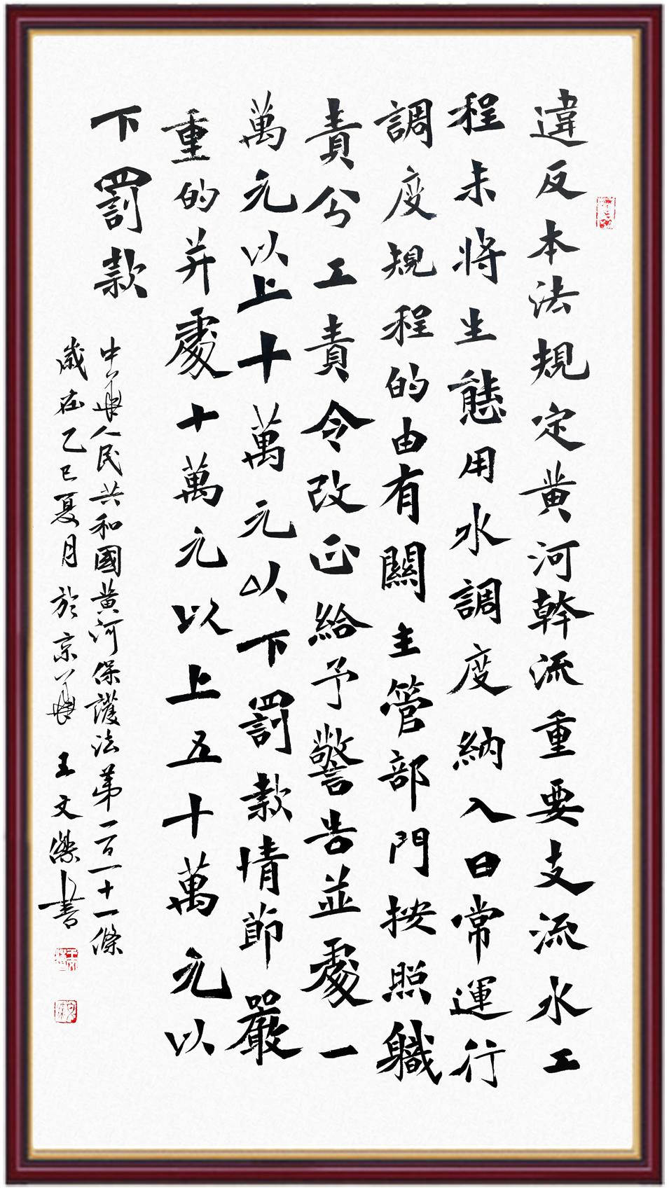 黃河寧,天下平。黃河是中華民族的發(fā)源地和搖籃,保護黃河是事關中華民族偉大復興的千秋大計?!吨腥A人民共和國黃河保護法》為推進水資源節(jié)約集約利用、保護傳承弘揚黃河文化、推動黃河流域生態(tài)保護和高質(zhì)量發(fā)展提供了有力法治保障。繼書寫《中華人民共和國民法典》《中華人民共和國憲法》《中華人民共和國澳門特別行政區(qū)基本法》《中華人民共和國香港特別行政區(qū)基本法》《中華人民共和國國旗法》《中華人民共和國國徽法》《中華人民共和國國歌法》《中華人民共和國法官法》等法律法規(guī)之后,法制日報社聯(lián)合沿黃九省(區(qū))司法廳、書法家協(xié)會,將筆端對準《中華人民共和國黃河保護法》。