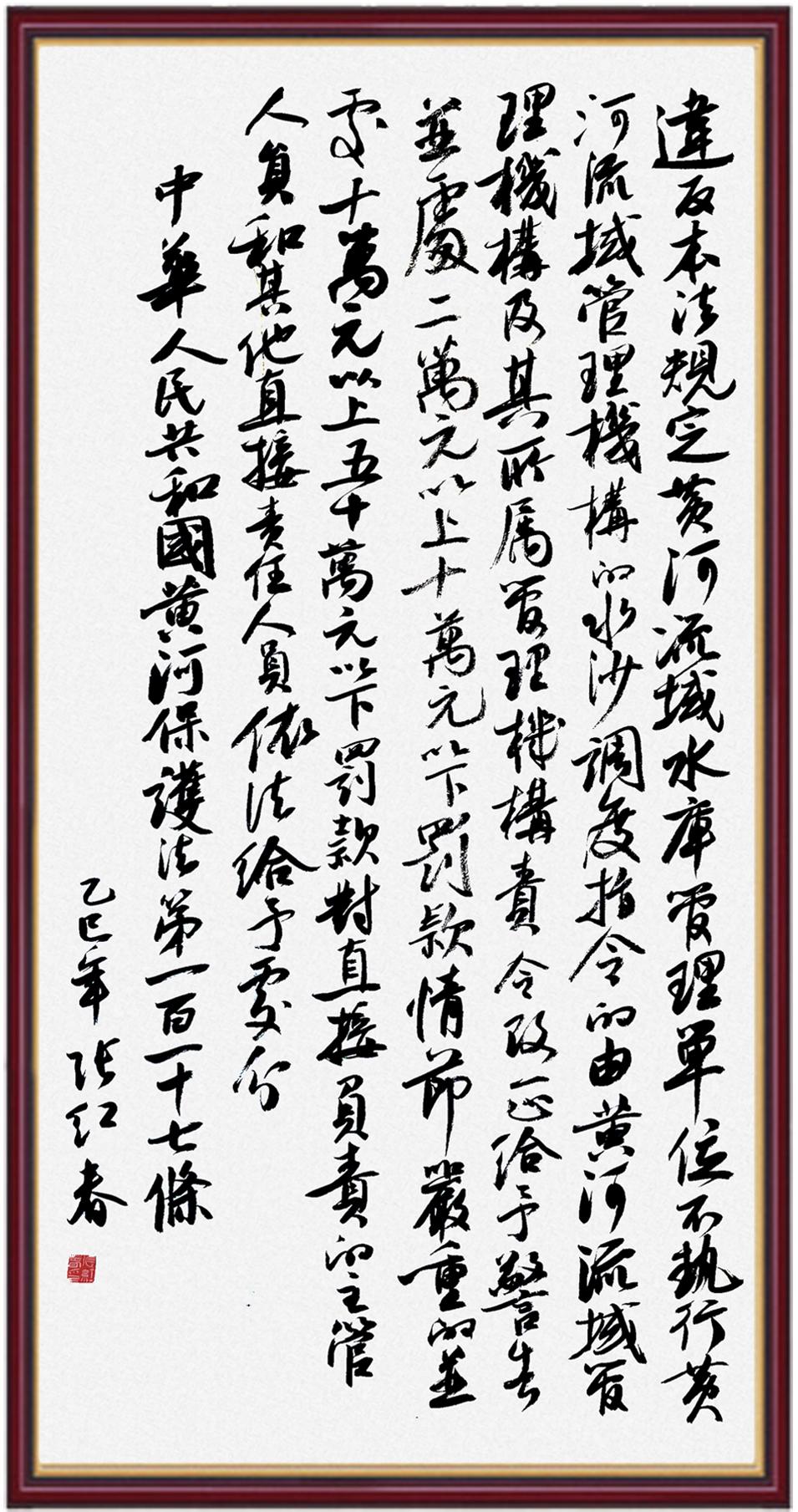 黃河寧,天下平。黃河是中華民族的發(fā)源地和搖籃,保護(hù)黃河是事關(guān)中華民族偉大復(fù)興的千秋大計(jì)?!吨腥A人民共和國(guó)黃河保護(hù)法》為推進(jìn)水資源節(jié)約集約利用、保護(hù)傳承弘揚(yáng)黃河文化、推動(dòng)黃河流域生態(tài)保護(hù)和高質(zhì)量發(fā)展提供了有力法治保障。繼書(shū)寫(xiě)《中華人民共和國(guó)民法典》《中華人民共和國(guó)憲法》《中華人民共和國(guó)澳門(mén)特別行政區(qū)基本法》《中華人民共和國(guó)香港特別行政區(qū)基本法》《中華人民共和國(guó)國(guó)旗法》《中華人民共和國(guó)國(guó)徽法》《中華人民共和國(guó)國(guó)歌法》《中華人民共和國(guó)法官法》等法律法規(guī)之后,法制日?qǐng)?bào)社聯(lián)合沿黃九?。▍^(qū))司法廳、書(shū)法家協(xié)會(huì),將筆端對(duì)準(zhǔn)《中華人民共和國(guó)黃河保護(hù)法》。