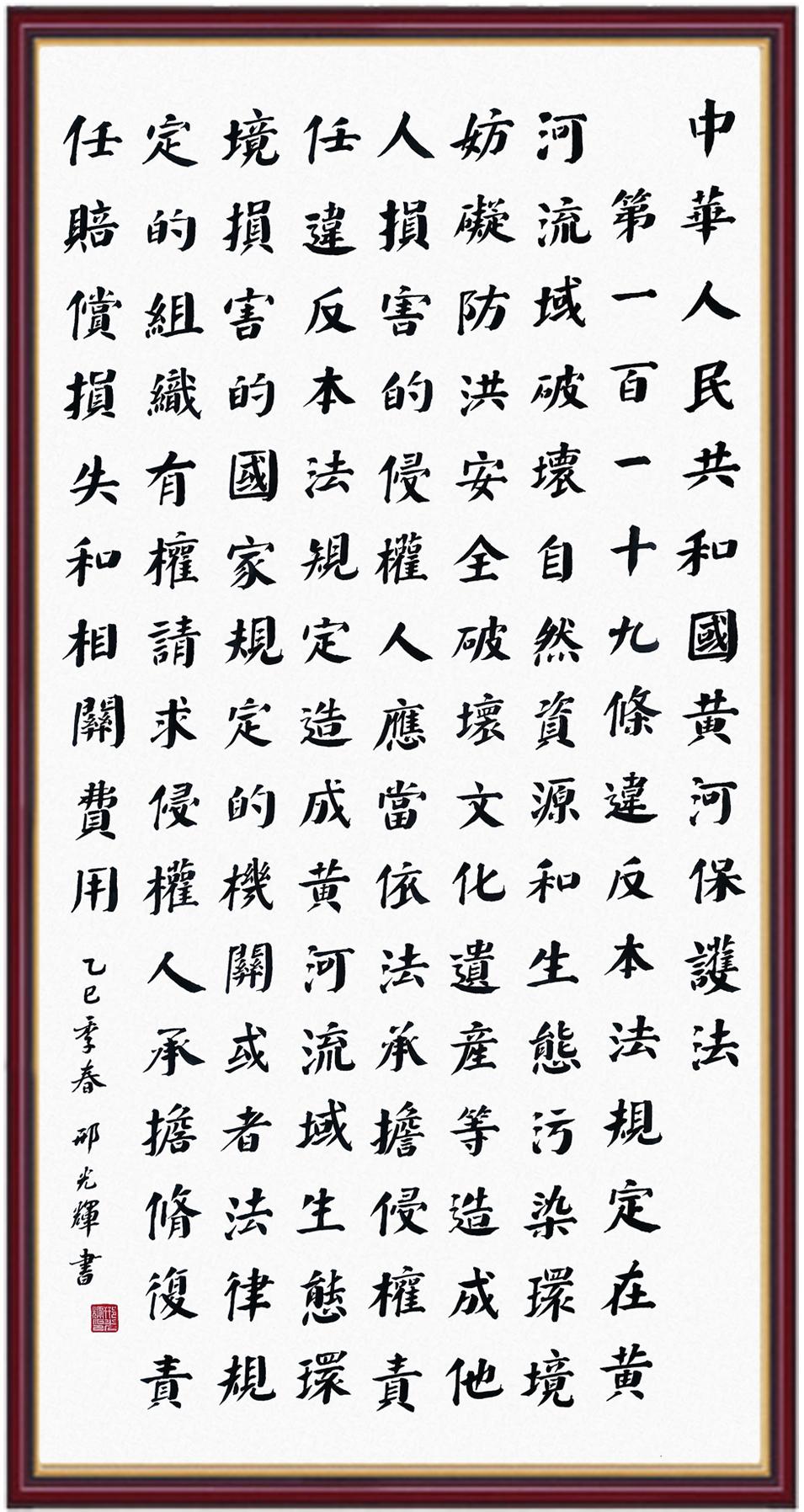 黃河寧,天下平。黃河是中華民族的發(fā)源地和搖籃,保護(hù)黃河是事關(guān)中華民族偉大復(fù)興的千秋大計(jì)?!吨腥A人民共和國(guó)黃河保護(hù)法》為推進(jìn)水資源節(jié)約集約利用、保護(hù)傳承弘揚(yáng)黃河文化、推動(dòng)黃河流域生態(tài)保護(hù)和高質(zhì)量發(fā)展提供了有力法治保障。繼書寫《中華人民共和國(guó)民法典》《中華人民共和國(guó)憲法》《中華人民共和國(guó)澳門特別行政區(qū)基本法》《中華人民共和國(guó)香港特別行政區(qū)基本法》《中華人民共和國(guó)國(guó)旗法》《中華人民共和國(guó)國(guó)徽法》《中華人民共和國(guó)國(guó)歌法》《中華人民共和國(guó)法官法》等法律法規(guī)之后,法制日?qǐng)?bào)社聯(lián)合沿黃九?。▍^(qū))司法廳、書法家協(xié)會(huì),將筆端對(duì)準(zhǔn)《中華人民共和國(guó)黃河保護(hù)法》。