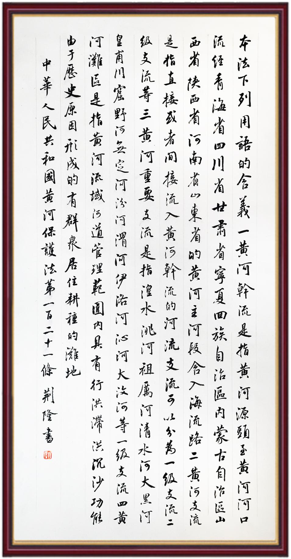 黃河寧,天下平。黃河是中華民族的發(fā)源地和搖籃,保護(hù)黃河是事關(guān)中華民族偉大復(fù)興的千秋大計(jì)。《中華人民共和國(guó)黃河保護(hù)法》為推進(jìn)水資源節(jié)約集約利用、保護(hù)傳承弘揚(yáng)黃河文化、推動(dòng)黃河流域生態(tài)保護(hù)和高質(zhì)量發(fā)展提供了有力法治保障。繼書(shū)寫(xiě)《中華人民共和國(guó)民法典》《中華人民共和國(guó)憲法》《中華人民共和國(guó)澳門特別行政區(qū)基本法》《中華人民共和國(guó)香港特別行政區(qū)基本法》《中華人民共和國(guó)國(guó)旗法》《中華人民共和國(guó)國(guó)徽法》《中華人民共和國(guó)國(guó)歌法》《中華人民共和國(guó)法官法》等法律法規(guī)之后,法制日?qǐng)?bào)社聯(lián)合沿黃九省(區(qū))司法廳、書(shū)法家協(xié)會(huì),將筆端對(duì)準(zhǔn)《中華人民共和國(guó)黃河保護(hù)法》。
