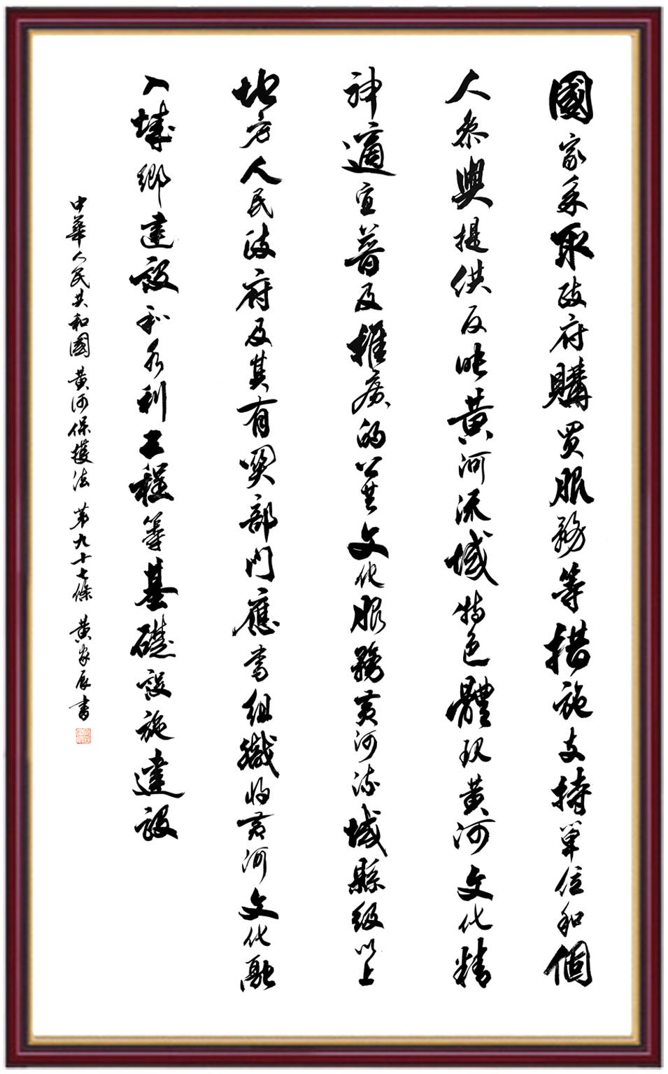 黃河寧,天下平。黃河是中華民族的發(fā)源地和搖籃,保護(hù)黃河是事關(guān)中華民族偉大復(fù)興的千秋大計(jì)?!吨腥A人民共和國黃河保護(hù)法》為推進(jìn)水資源節(jié)約集約利用、保護(hù)傳承弘揚(yáng)黃河文化、推動(dòng)黃河流域生態(tài)保護(hù)和高質(zhì)量發(fā)展提供了有力法治保障。繼書寫《中華人民共和國民法典》《中華人民共和國憲法》《中華人民共和國澳門特別行政區(qū)基本法》《中華人民共和國香港特別行政區(qū)基本法》《中華人民共和國國旗法》《中華人民共和國國徽法》《中華人民共和國國歌法》《中華人民共和國法官法》等法律法規(guī)之后,法制日?qǐng)?bào)社聯(lián)合沿黃九?。▍^(qū))司法廳、書法家協(xié)會(huì),將筆端對(duì)準(zhǔn)《中華人民共和國黃河保護(hù)法》。