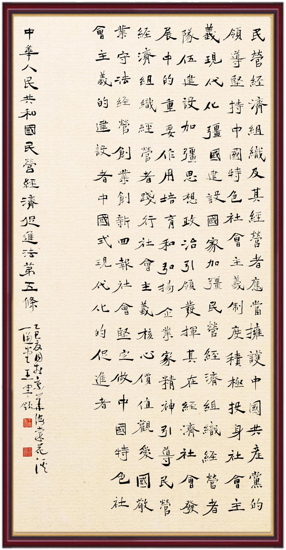 《中華人民共和國民營經(jīng)濟促進法》自今年5月20日起施行。作為我國首部專門關(guān)于民營經(jīng)濟發(fā)展的基礎(chǔ)性法律,民營經(jīng)濟促進法將支持和保障民營經(jīng)濟發(fā)展的法律制度融入中國特色社會主義法律體系,具有重大的法治意義,為促進民營經(jīng)濟持續(xù)、健康、高質(zhì)量發(fā)展提供了堅實的法治保障。為更好地學(xué)習(xí)、宣傳、貫徹這部法律,法治日報社聯(lián)合司法部普法與依法治理局,開展“‘書·法’系列活動之書寫《中華人民共和國民營經(jīng)濟促進法》”活動。