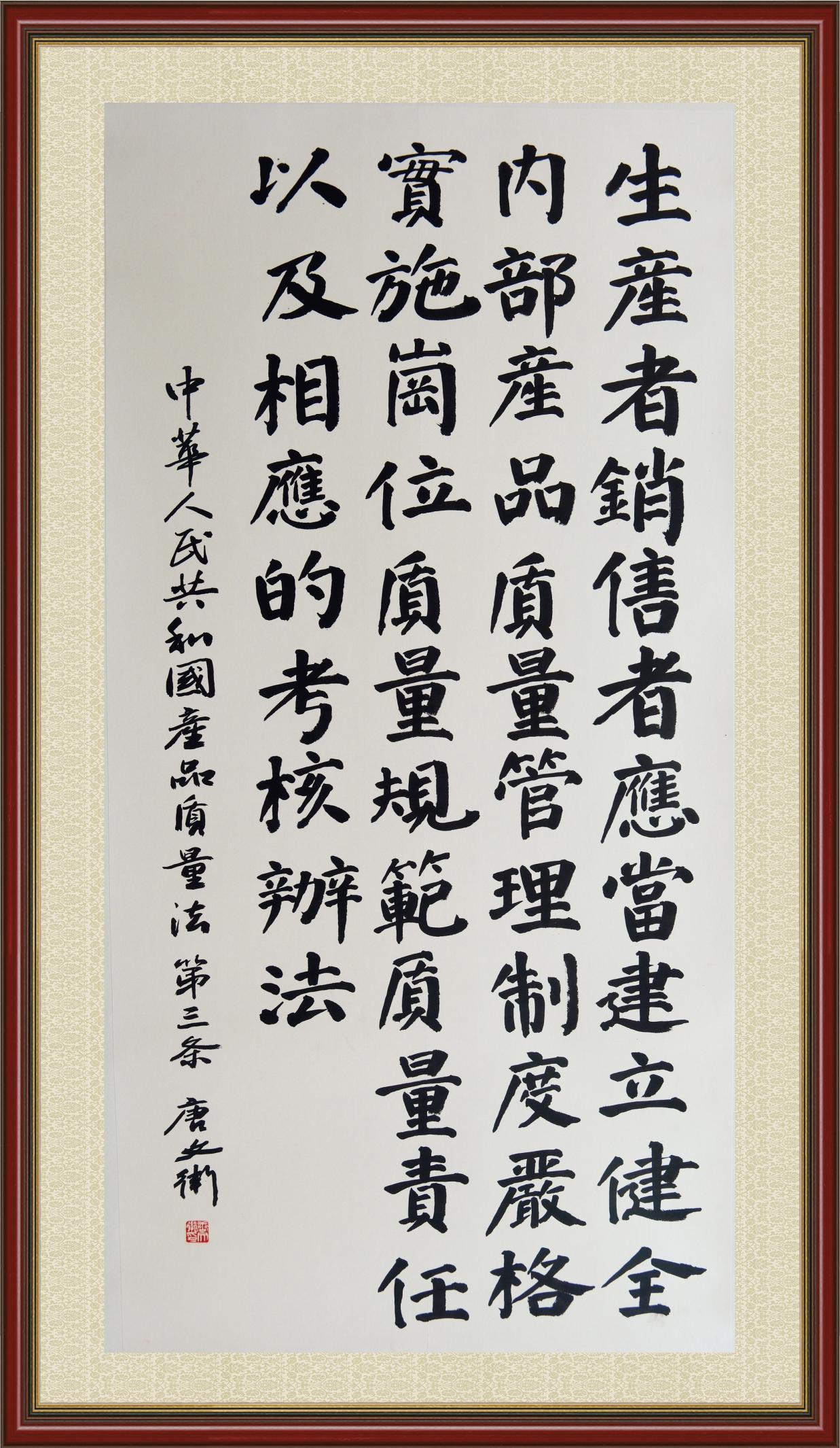 《中華人民共和國產(chǎn)品質(zhì)量法》自1993年9月1日起開始施行,先后進行三次修正。作為產(chǎn)品質(zhì)量領(lǐng)域的基本法律,產(chǎn)品質(zhì)量法對規(guī)范產(chǎn)品質(zhì)量管理、維護消費者合法權(quán)益、促進經(jīng)濟社會發(fā)展具有重要意義。為更好地學習、宣傳、貫徹這部法律,在國家市場監(jiān)督管理總局法規(guī)司的支持下,法治日報社開展了“‘書·法’系列活動之書寫《中華人民共和國產(chǎn)品質(zhì)量法》”活動。