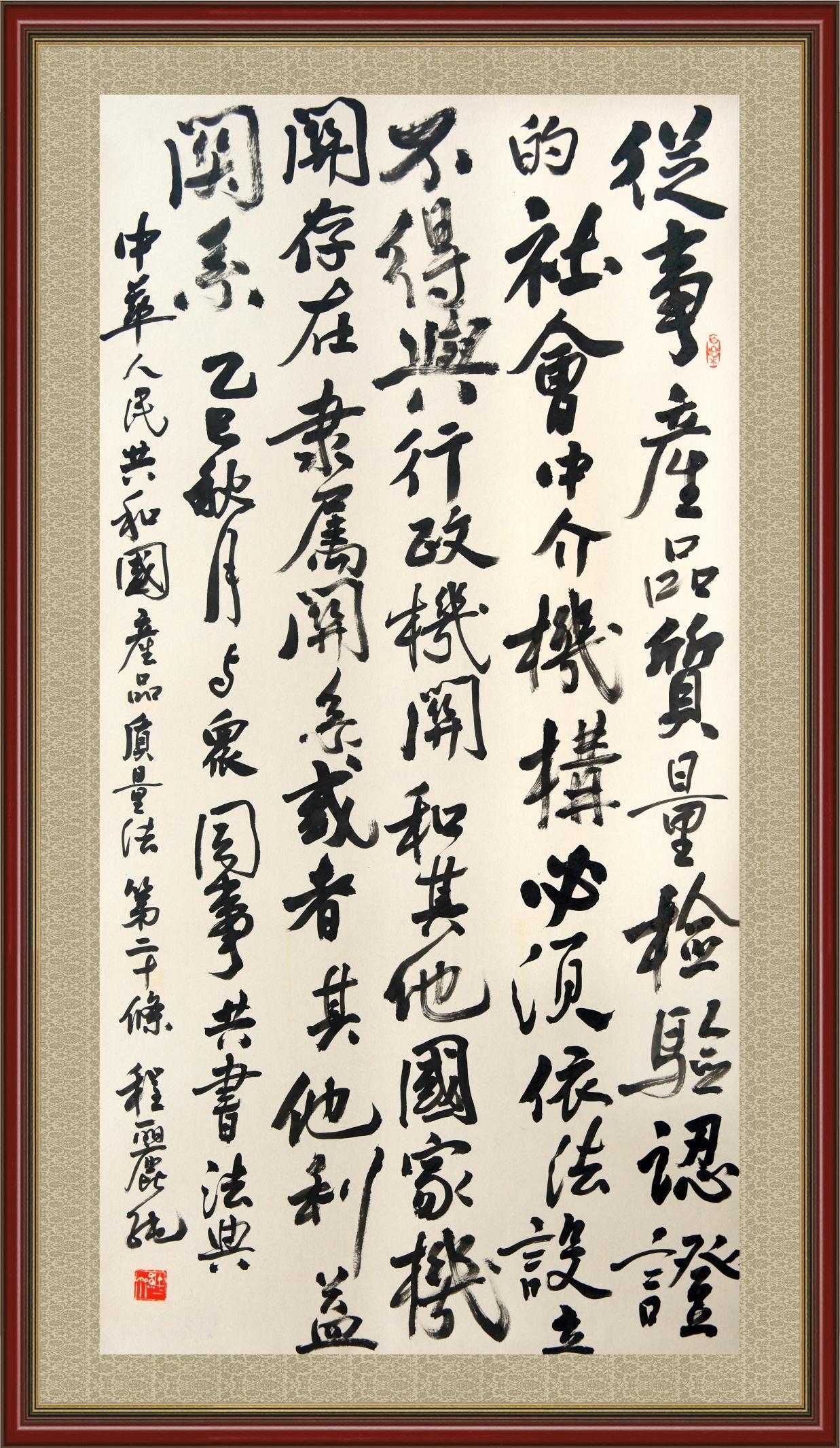 《中華人民共和國(guó)產(chǎn)品質(zhì)量法》自1993年9月1日起開(kāi)始施行,先后進(jìn)行三次修正。作為產(chǎn)品質(zhì)量領(lǐng)域的基本法律,產(chǎn)品質(zhì)量法對(duì)規(guī)范產(chǎn)品質(zhì)量管理、維護(hù)消費(fèi)者合法權(quán)益、促進(jìn)經(jīng)濟(jì)社會(huì)發(fā)展具有重要意義。為更好地學(xué)習(xí)、宣傳、貫徹這部法律,在國(guó)家市場(chǎng)監(jiān)督管理總局法規(guī)司的支持下,法治日?qǐng)?bào)社開(kāi)展了“‘書(shū)·法’系列活動(dòng)之書(shū)寫(xiě)《中華人民共和國(guó)產(chǎn)品質(zhì)量法》”活動(dòng)。