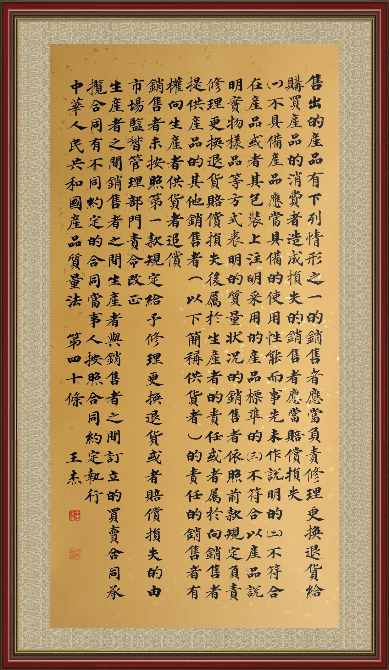《中華人民共和國產(chǎn)品質(zhì)量法》自1993年9月1日起開始施行,先后進(jìn)行三次修正。作為產(chǎn)品質(zhì)量領(lǐng)域的基本法律,產(chǎn)品質(zhì)量法對規(guī)范產(chǎn)品質(zhì)量管理、維護(hù)消費(fèi)者合法權(quán)益、促進(jìn)經(jīng)濟(jì)社會發(fā)展具有重要意義。為更好地學(xué)習(xí)、宣傳、貫徹這部法律,在國家市場監(jiān)督管理總局法規(guī)司的支持下,法治日報社開展了“‘書·法’系列活動之書寫《中華人民共和國產(chǎn)品質(zhì)量法》”活動。
