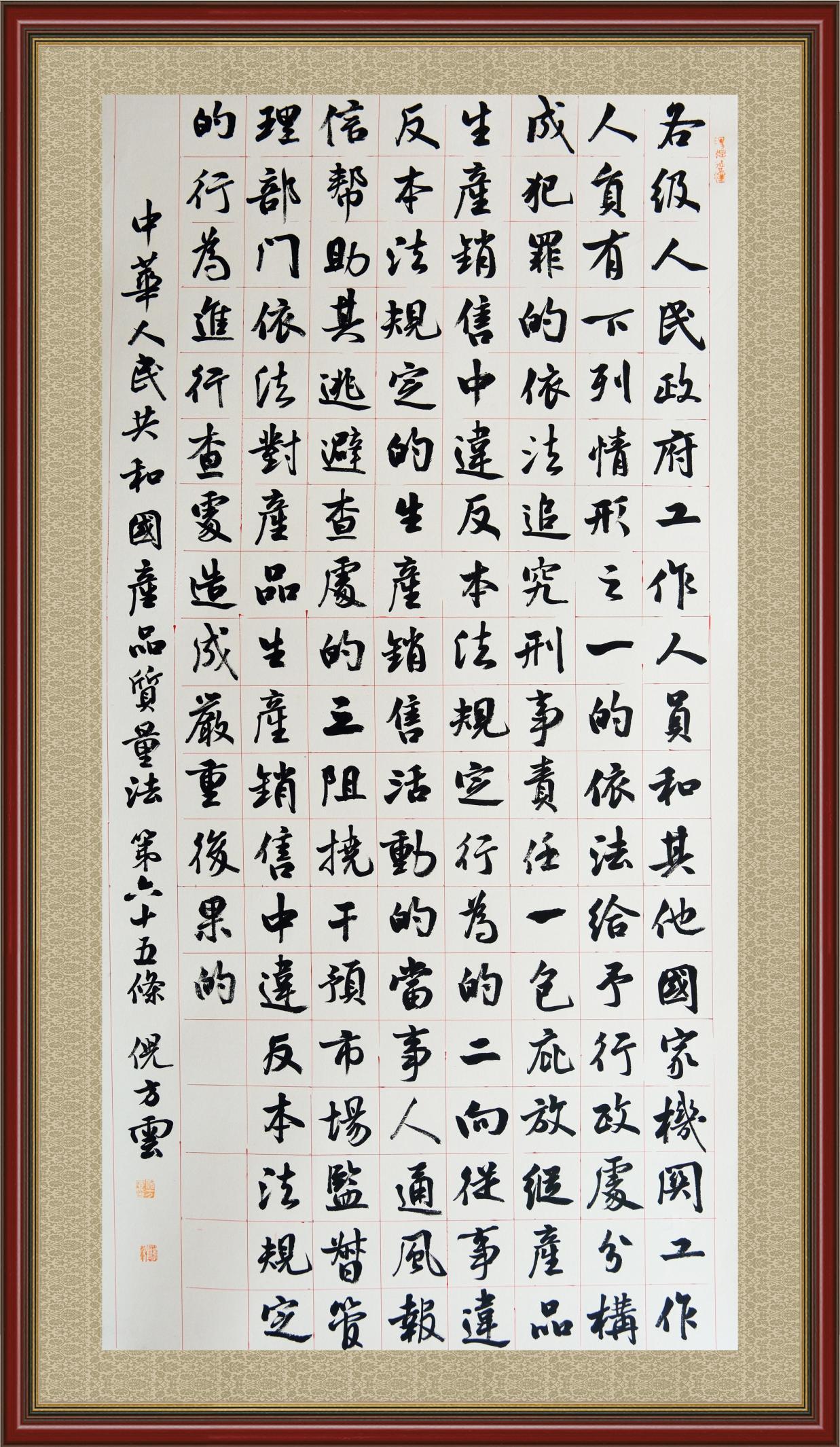 《中華人民共和國產(chǎn)品質(zhì)量法》自1993年9月1日起開始施行,先后進(jìn)行三次修正。作為產(chǎn)品質(zhì)量領(lǐng)域的基本法律,產(chǎn)品質(zhì)量法對規(guī)范產(chǎn)品質(zhì)量管理、維護(hù)消費(fèi)者合法權(quán)益、促進(jìn)經(jīng)濟(jì)社會發(fā)展具有重要意義。為更好地學(xué)習(xí)、宣傳、貫徹這部法律,在國家市場監(jiān)督管理總局法規(guī)司的支持下,法治日報社開展了“‘書·法’系列活動之書寫《中華人民共和國產(chǎn)品質(zhì)量法》”活動。