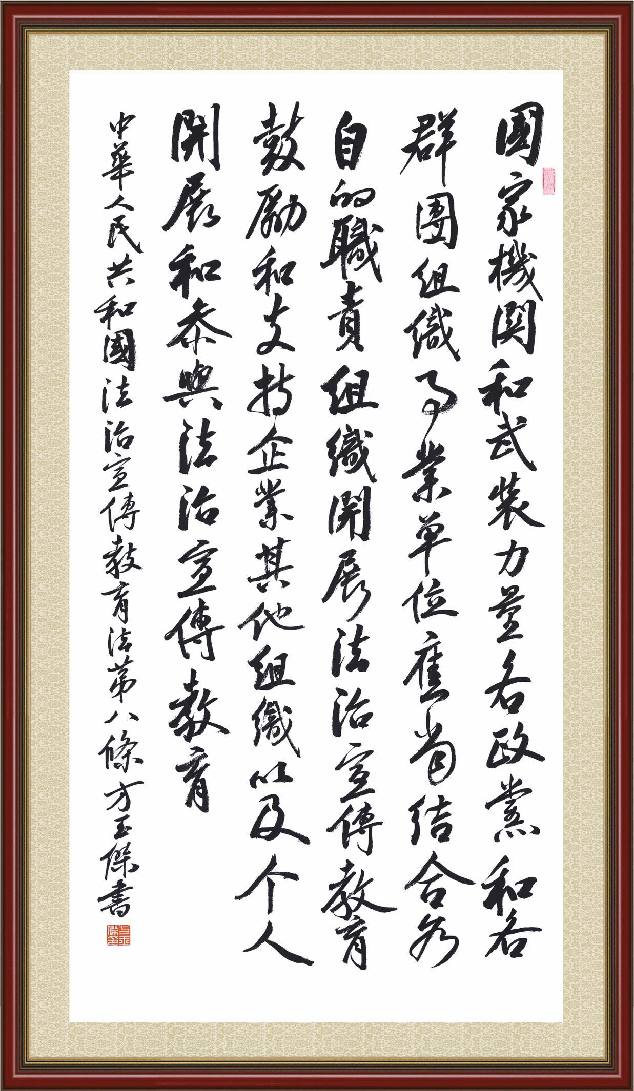 2020年7月11日,由法治日?qǐng)?bào)社主辦的“書·法”系列活動(dòng)正式啟動(dòng),先后書寫《中華人民共和國民法典》《中華人民共和國憲法》《中華人民共和國民營經(jīng)濟(jì)促進(jìn)法》等21部法律法規(guī)。