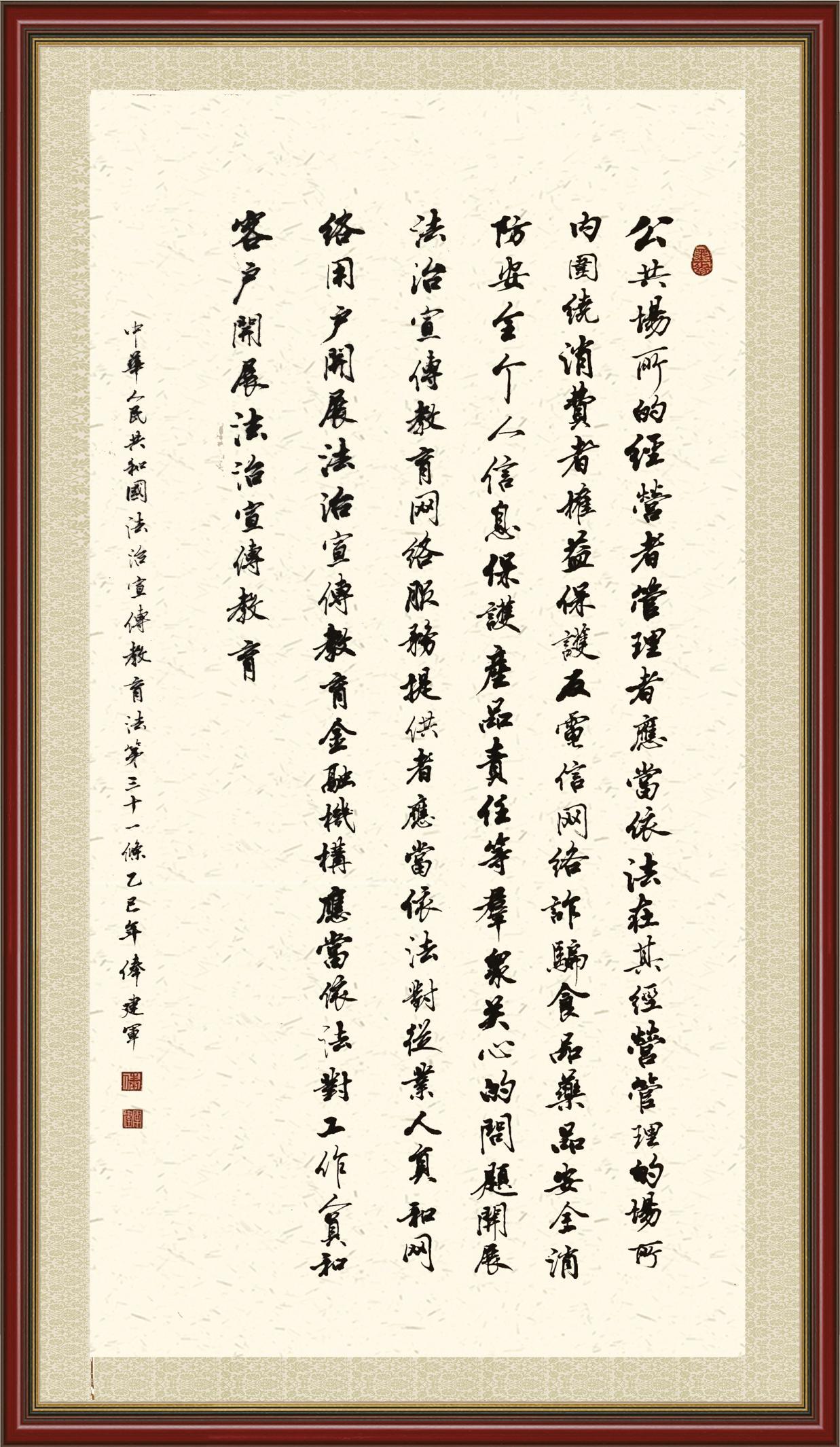 2020年7月11日,由法治日報(bào)社主辦的“書·法”系列活動正式啟動,先后書寫《中華人民共和國民法典》《中華人民共和國憲法》《中華人民共和國民營經(jīng)濟(jì)促進(jìn)法》等21部法律法規(guī)。