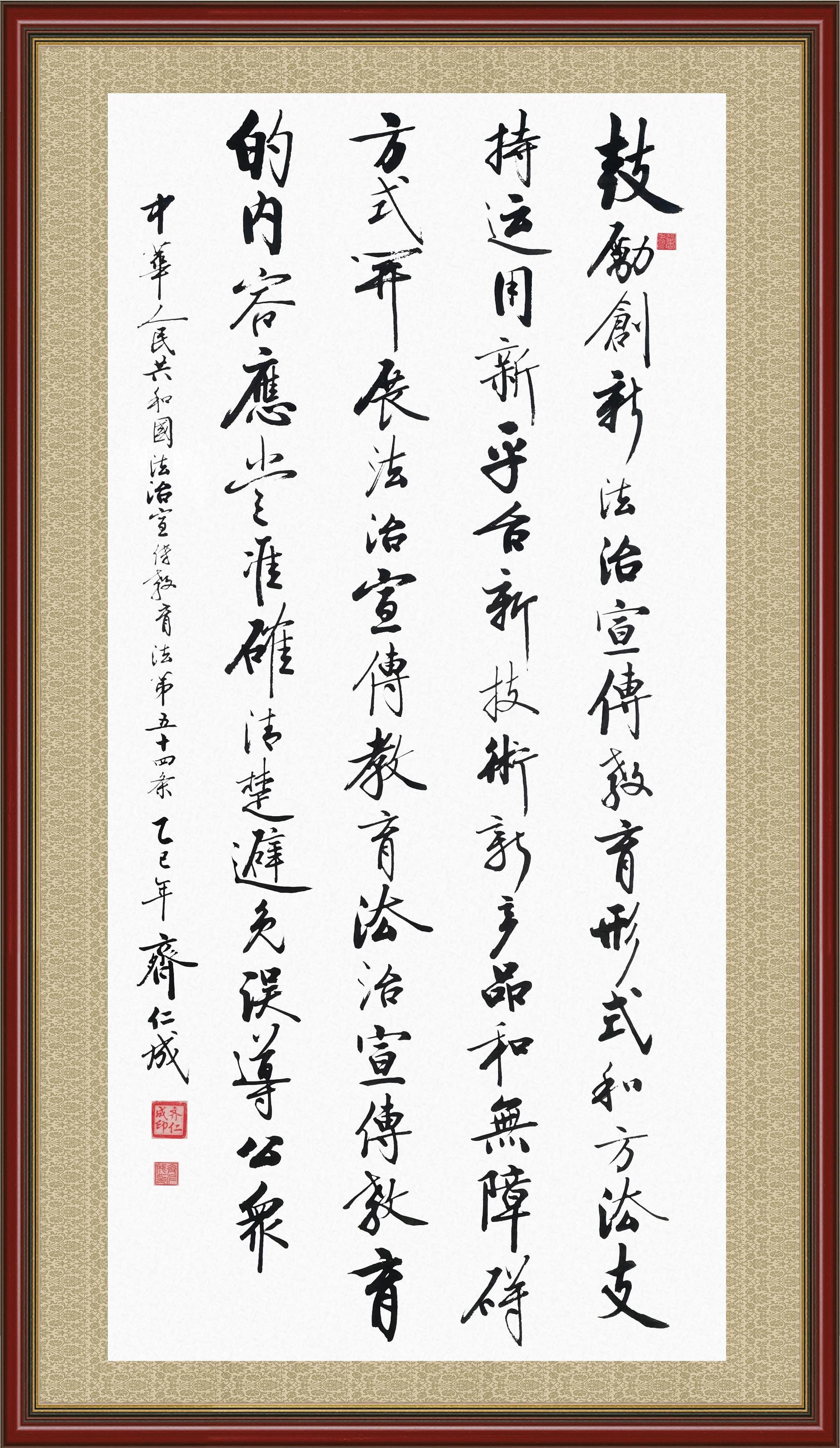 2020年7月11日,由法治日報社主辦的“書·法”系列活動正式啟動,先后書寫《中華人民共和國民法典》《中華人民共和國憲法》《中華人民共和國民營經(jīng)濟促進法》等21部法律法規(guī)。
