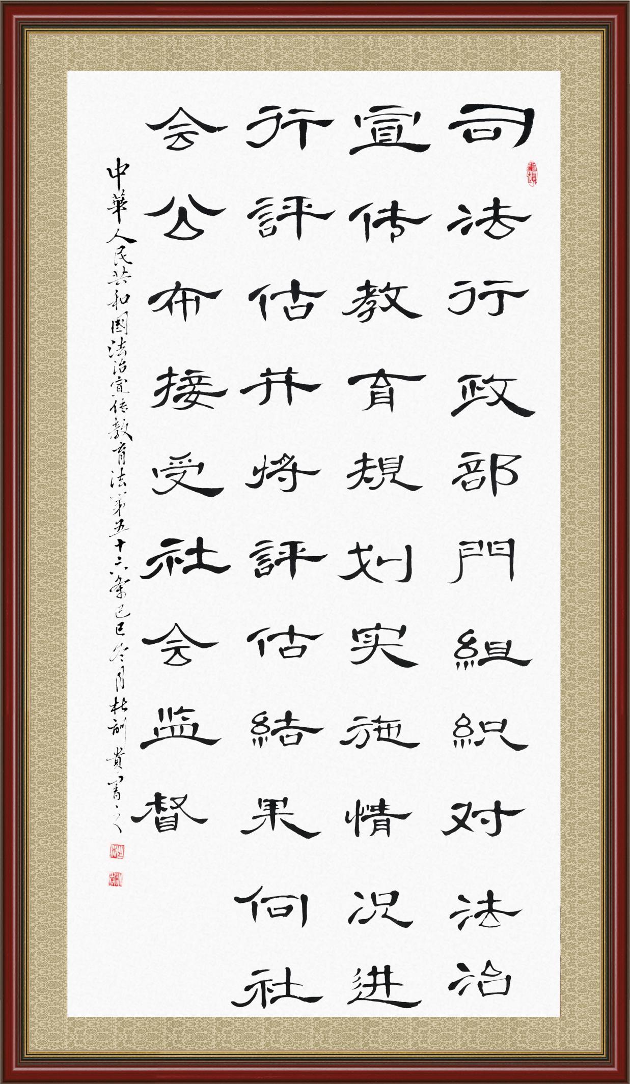2020年7月11日,由法治日報社主辦的“書·法”系列活動正式啟動,先后書寫《中華人民共和國民法典》《中華人民共和國憲法》《中華人民共和國民營經(jīng)濟促進法》等21部法律法規(guī)。
