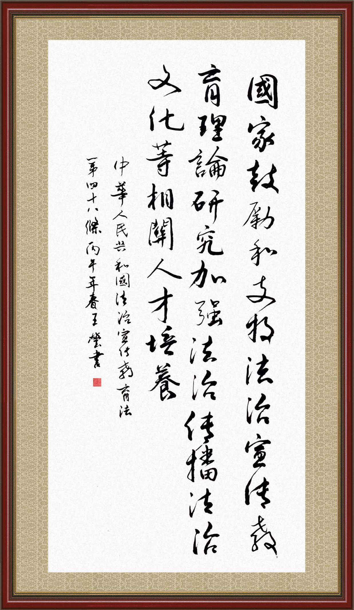 2020年7月11日,由法治日報社主辦的“書·法”系列活動正式啟動,先后書寫《中華人民共和國民法典》《中華人民共和國憲法》《中華人民共和國民營經(jīng)濟促進法》等21部法律法規(guī)。
