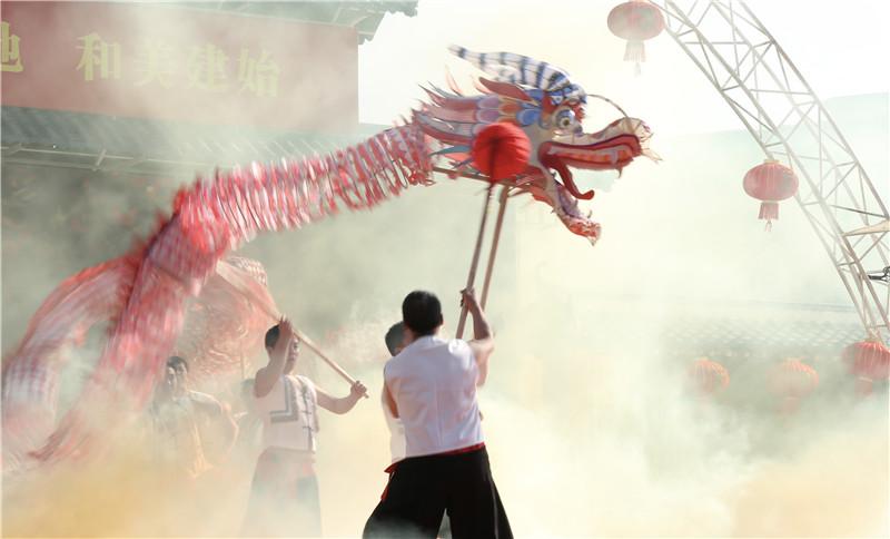 裝龍、“點(diǎn)睛”、祭拜祖龍、拋五谷、火龍開喉等一系列傳統(tǒng)火龍民俗表演讓村里熱鬧非凡,金色的火龍、紅色的獅子和彩色蓮船在村落里上下翻飛、龍騰虎躍,連綿數(shù)十米。