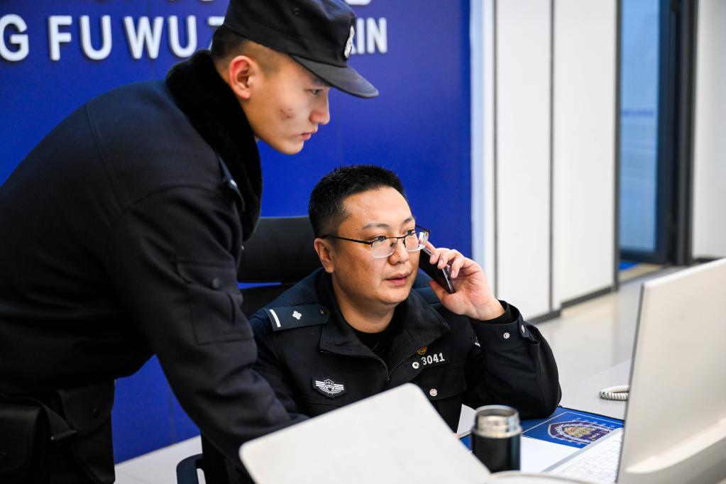 2月5日,通遼市奈曼旗公安局大沁他拉派出所民警們?cè)诰C合指揮室值班。