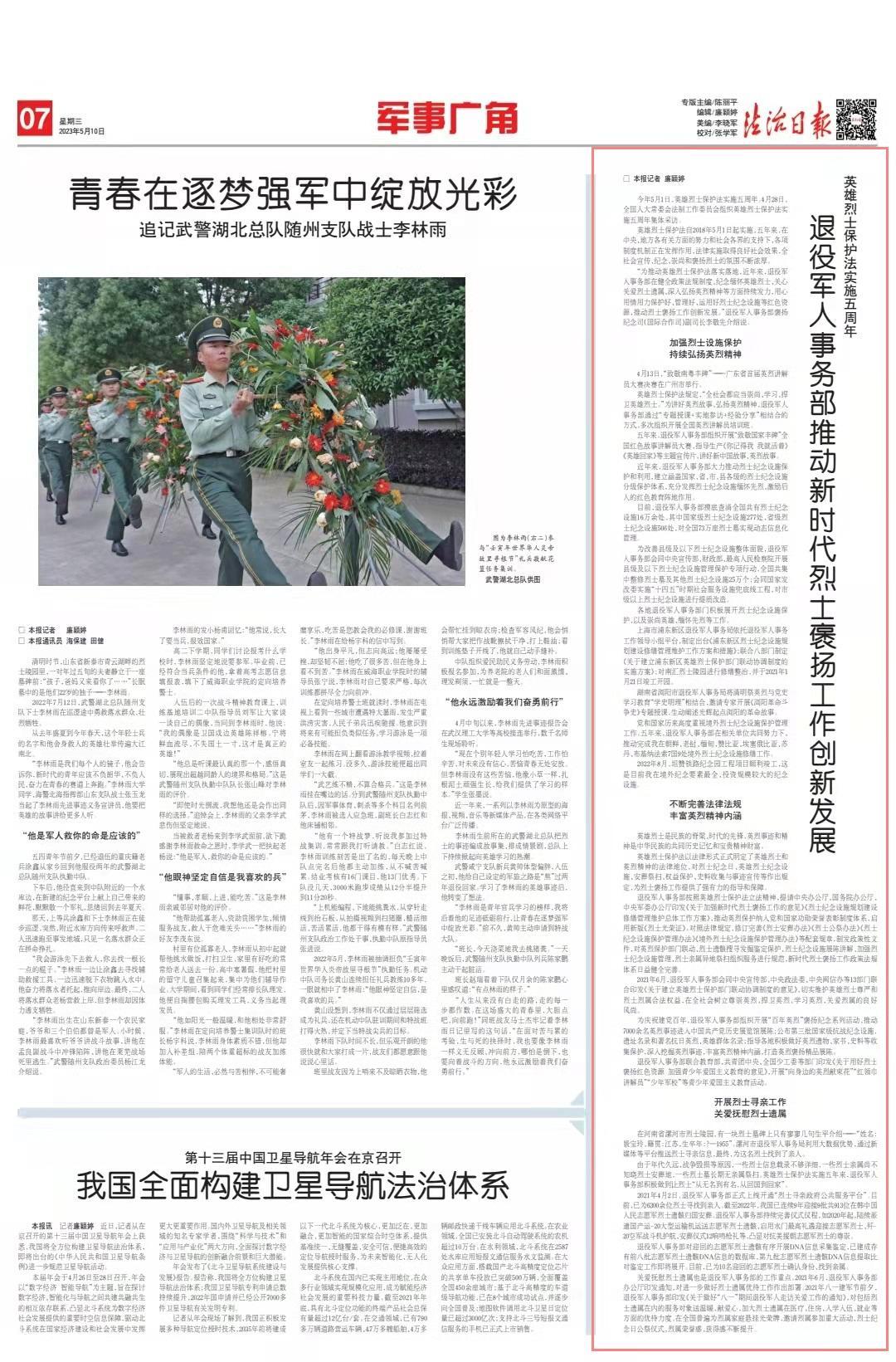 英雄烈士保護法自2018年5月1日起實施,五年來,在中央、地方各有關方面的努力和社會各界的支持下,各項制度機制正在發(fā)揮作用,法律實施取得良好社會效果,全社會宣傳、紀念、崇尚和褒揚烈士的氛圍不斷濃厚。