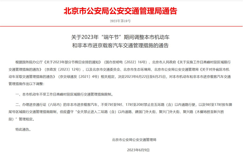 中新網(wǎng)6月14日電據(jù)北京市公安局公安交通管理局網(wǎng)站消息,北京市公安局公安交通管理局近日發(fā)布通告稱,根據(jù)國(guó)務(wù)院辦公廳《關(guān)于2023年部分節(jié)假日安排的通知》(國(guó)辦發(fā)明電〔2022〕16號(hào))、北京市人民政府《關(guān)于實(shí)施工作日高峰時(shí)段區(qū)域限行交通管理措施的通告》(京政發(fā)〔2023〕12號(hào)),以及北京市交通委員會(huì)、北京市生態(tài)環(huán)境局、北京市公安局公安交通管理局《關(guān)于對(duì)外省區(qū)市機(jī)動(dòng)車采取交通管理措施的通告》(京交綠通發(fā)〔2021〕4號(hào))相關(guān)規(guī)定,決定2023年6月22日至6月25日,對(duì)本市機(jī)動(dòng)車和非本市進(jìn)京載客汽車交通管理措施作出以下調(diào)整: