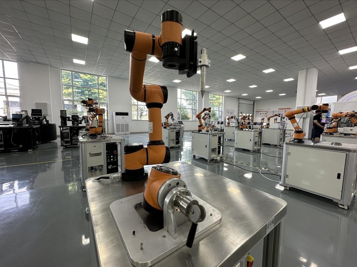遨博(山東)智能機(jī)器人有限公司的六軸協(xié)作機(jī)器人,正在演示工業(yè)場(chǎng)景中的模塊組裝