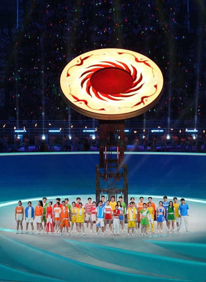 在成都大運(yùn)會(huì)上,“太陽(yáng)神鳥”的金色身影隨處可見。東安湖體育公園主體育場(chǎng)上方,巴掌大小的太陽(yáng)神鳥金飾被放大了270萬(wàn)倍,上萬(wàn)塊彩釉玻璃拼裝出的“太陽(yáng)神鳥”,迎接大地的仰望和天空的俯瞰;它還騰躍于成都大運(yùn)會(huì)的火炬之上,淬火中展開理想,追求光明……