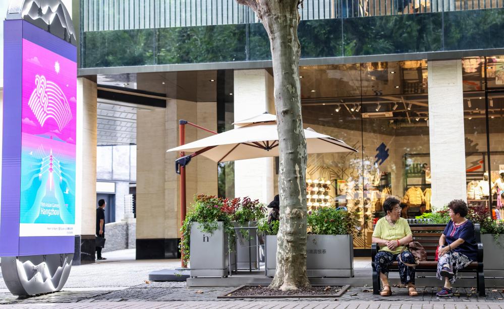 9月20日,市民在亞運(yùn)會(huì)主題標(biāo)識(shí)牌旁的長(zhǎng)椅上聊天。 新華社記者顏麟蘊(yùn) 攝