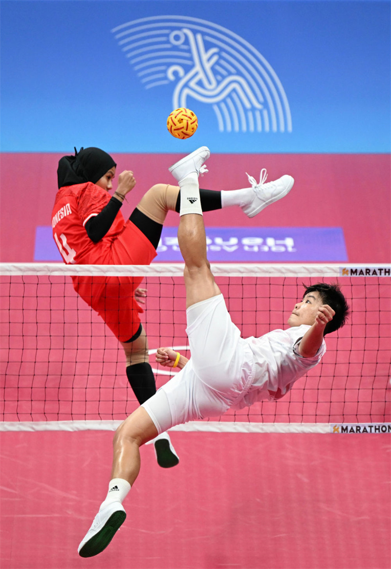 9月24日,泰國(guó)隊(duì)選手曼利卡·汶托(前)在杭州亞運(yùn)會(huì)藤球女子單組團(tuán)體預(yù)選賽A組比賽中進(jìn)攻。新華社記者 陳鐘昊 攝