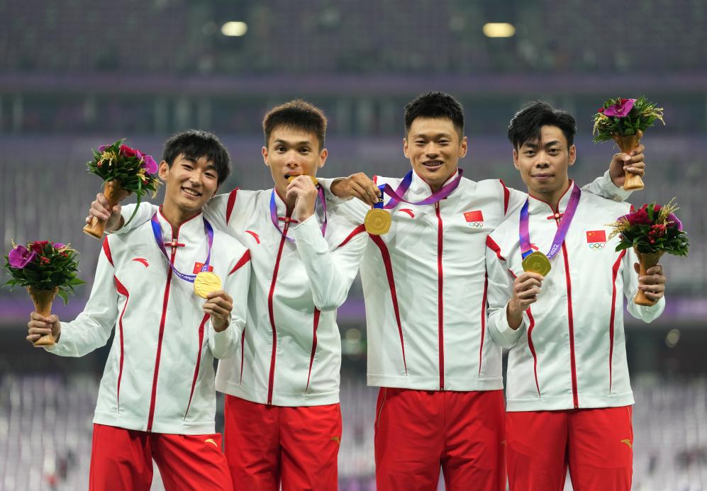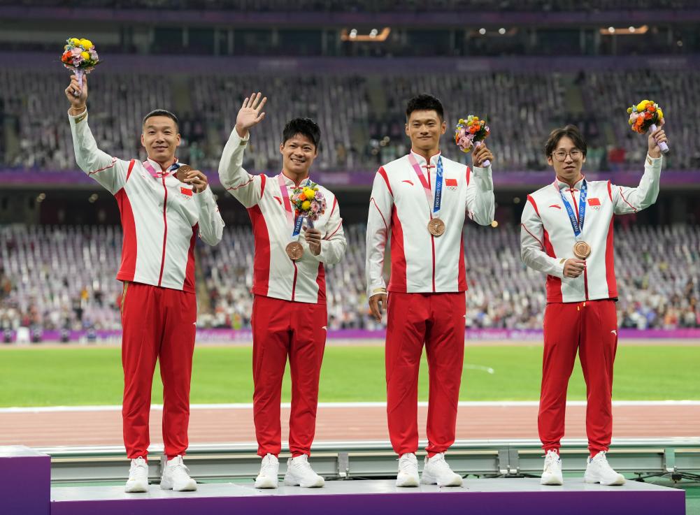 10月4日,湯星強、謝震業(yè)、蘇炳添、吳智強(從右至左)在遞補奧運獎牌頒獎儀式上。新華社記者 孫非 攝