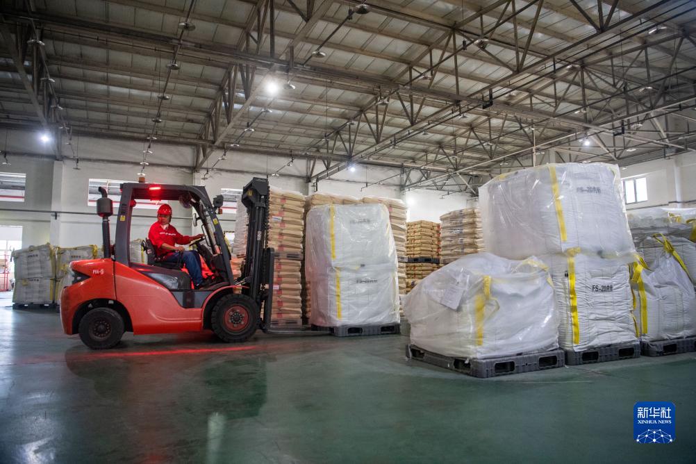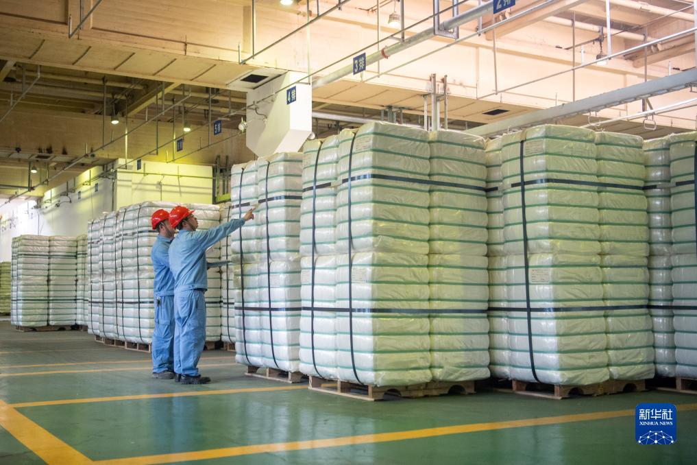 10月17日,在中國(guó)石化集團(tuán)重慶川維化工有限公司,工作人員在查看產(chǎn)品打包情況。