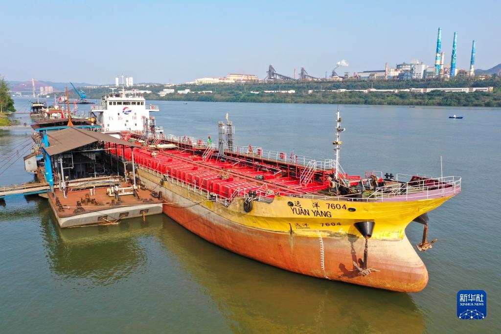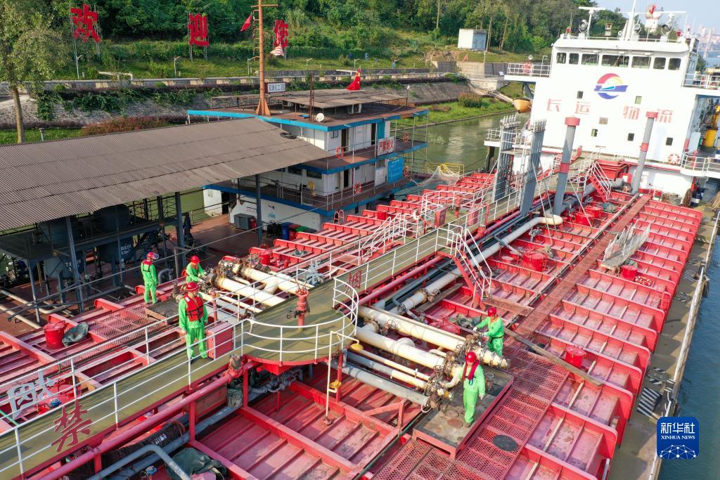 10月17日,在中國(guó)石化集團(tuán)重慶川維化工有限公司物流碼頭,出口的產(chǎn)品正在裝船(無(wú)人機(jī)照片)。