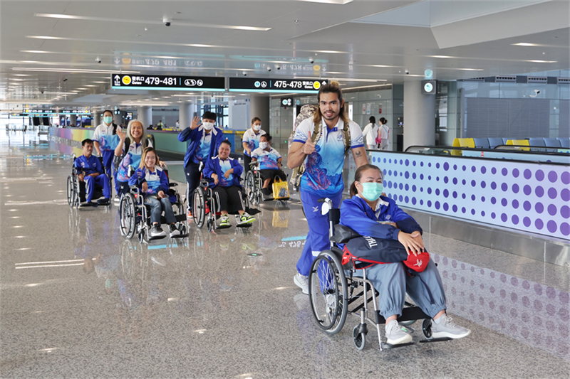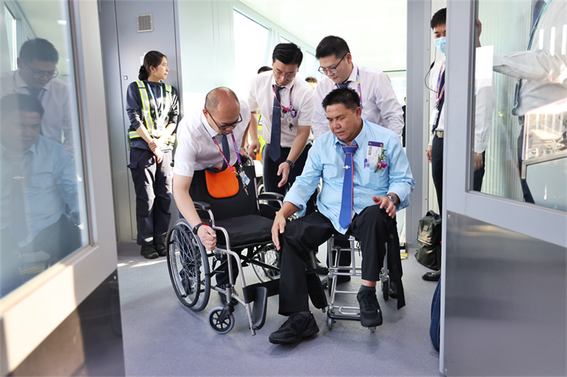 “一共219名代表團成員,其中78名輪椅旅客,下客艙后的轉(zhuǎn)換輪椅均已準備到位?!?4時50分,泰國代表團成員搭乘TG8062包機航班落地,工作人員早已提前備好轉(zhuǎn)換輪椅在艙門口等候。