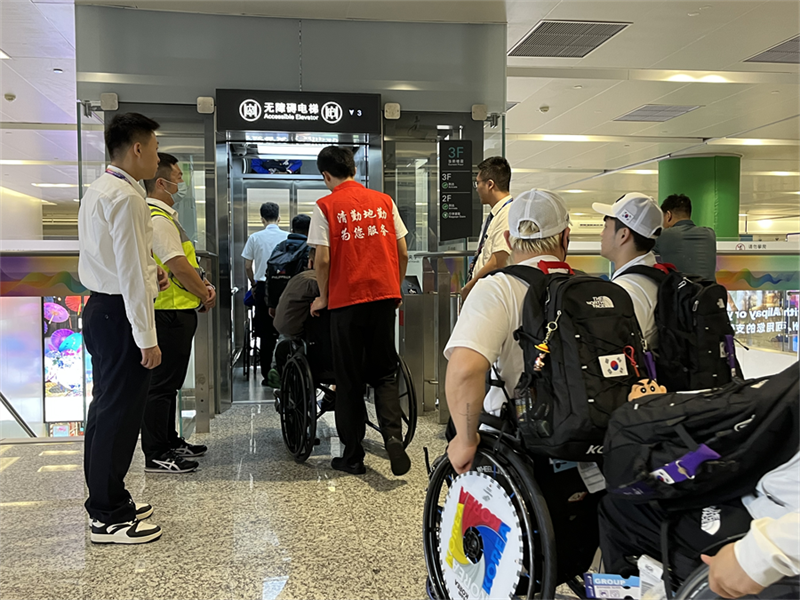 一路上,殘疾運動員沒有遇到一個臺階。廊橋口的無障礙電梯、流線上的無障礙坡道、清晰的標識標牌、隨處可見的低位飲水機及服務柜臺,完善的無障礙設施,都為殘疾運動員創(chuàng)造了便利的出行環(huán)境。抵離工作人員和志愿者全程的暖心陪伴,更是讓抵達流程“加速”與“升溫”。