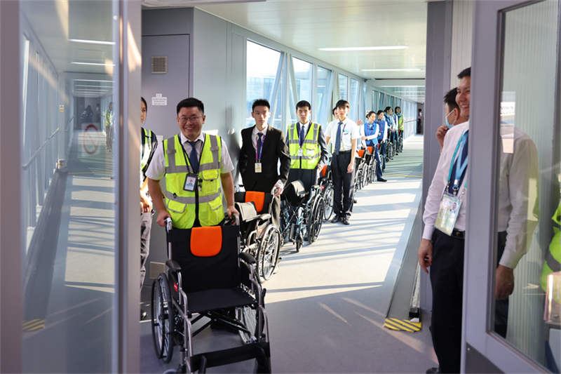 落地前,杭州蕭山國際機場聯(lián)合指揮中心就根據(jù)航班輪椅旅客數(shù)量、廊橋輪椅轉(zhuǎn)換空間等情況,合理安排停靠機位,同時對無障礙電梯進行專人管控。出艙后,工作人員開啟備用電梯,分流輪椅旅客,在進港各點位安排專人引導與協(xié)助,避免電梯口長時間等待滯留,提升代表團到達效率一倍以上。