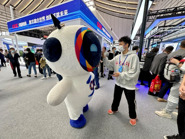 2022年11月9日,互聯(lián)網(wǎng)之光博覽會(huì)現(xiàn)場(chǎng),大會(huì)吉祥物“小互”在與觀(guān)眾互動(dòng)
