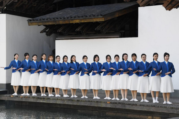 2022年11月6日,烏鎮(zhèn)互聯(lián)網(wǎng)國(guó)際會(huì)展中心,“小梧桐”志愿者拍攝合影