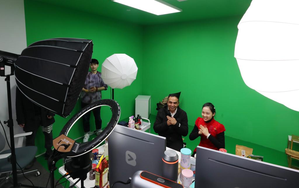 來自巴基斯坦的商人李龍(右二)在虹橋品匯的直播間內(nèi)直播。新華社記者方喆 攝
