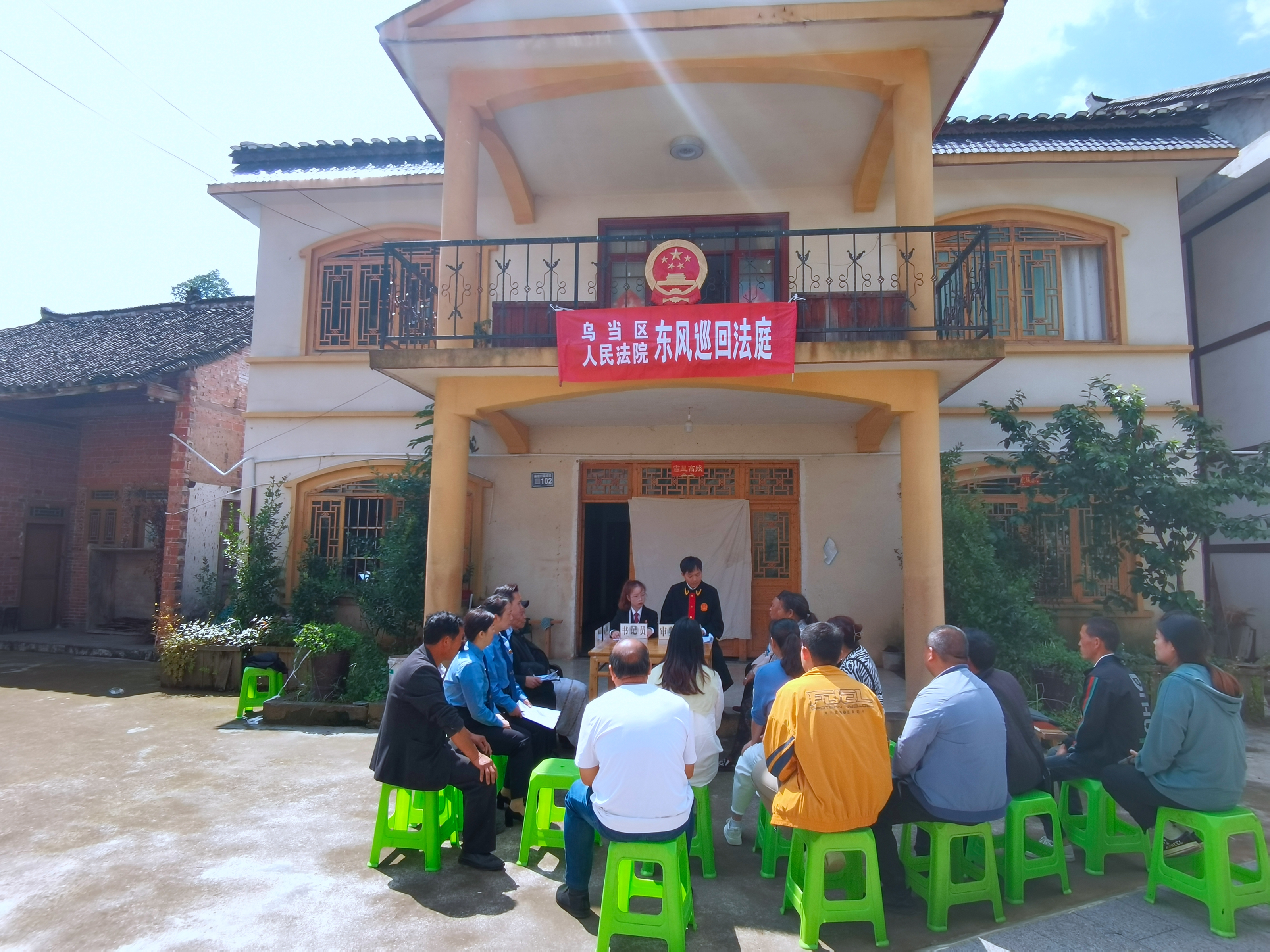 國徽掛欄,庭設(shè)院中,5月16日,烏當(dāng)區(qū)偏坡鄉(xiāng)偏坡村的一處農(nóng)家院里,烏當(dāng)區(qū)人民法院東風(fēng)法庭“就地取材”,在農(nóng)戶家的“飯桌”上進行了一場巡回審判,公開審理一起贍養(yǎng)費糾紛案件,烏當(dāng)區(qū)檢察院派員出庭支持起訴。案件的訴訟參與人及其親屬、烏當(dāng)區(qū)司法局偏坡鄉(xiāng)司法所、偏坡鄉(xiāng)平安辦等部門人員及部分村民一同參加了庭審。