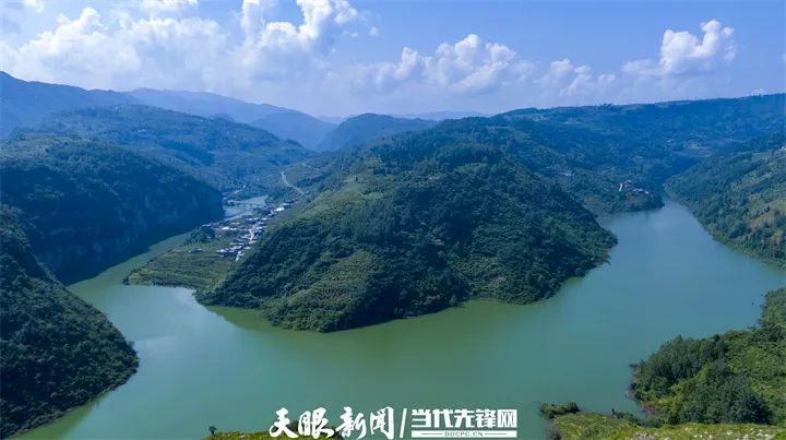 位于烏江源的畢節(jié)市納雍縣姑開鄉(xiāng)引底河呈現(xiàn)高峽平湖景觀,河面在藍(lán)天白云、青山綠樹映襯下美如畫。張曉勇 攝