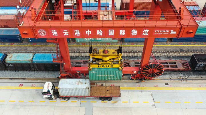 云臺(tái)山下、黃海之濱,江蘇自貿(mào)區(qū)連云港片區(qū)的中哈連云港物流合作基地,每天數(shù)以百計(jì)的集裝箱從這里搭乘中歐班列,駛往中亞。
