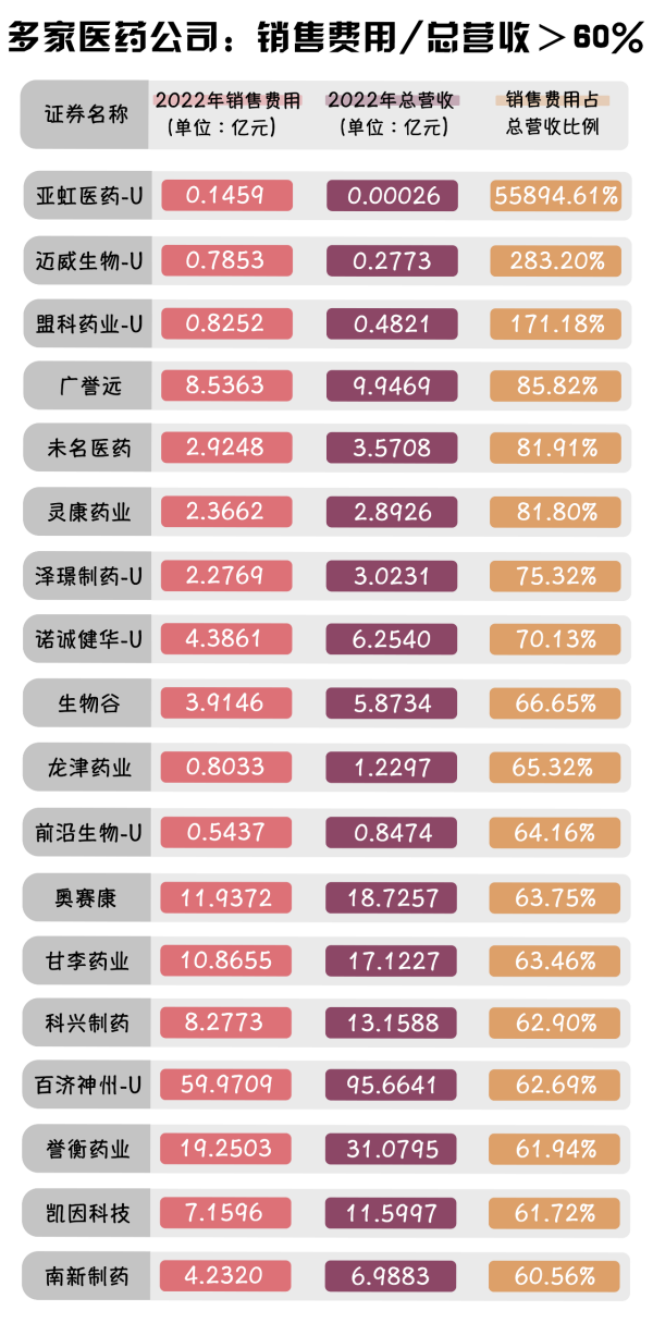 根據(jù)wind發(fā)布的數(shù)據(jù)顯示,從各藥企銷(xiāo)售費(fèi)用占總營(yíng)收比例來(lái)看,截至2022年底,共18家藥企的銷(xiāo)售費(fèi)用占總營(yíng)收比例超過(guò)60%,其中亞虹醫(yī)藥-U、邁威生物-U以及盟科藥業(yè)-U這三家藥企的銷(xiāo)售費(fèi)用占總營(yíng)收比例均超過(guò)了100%。