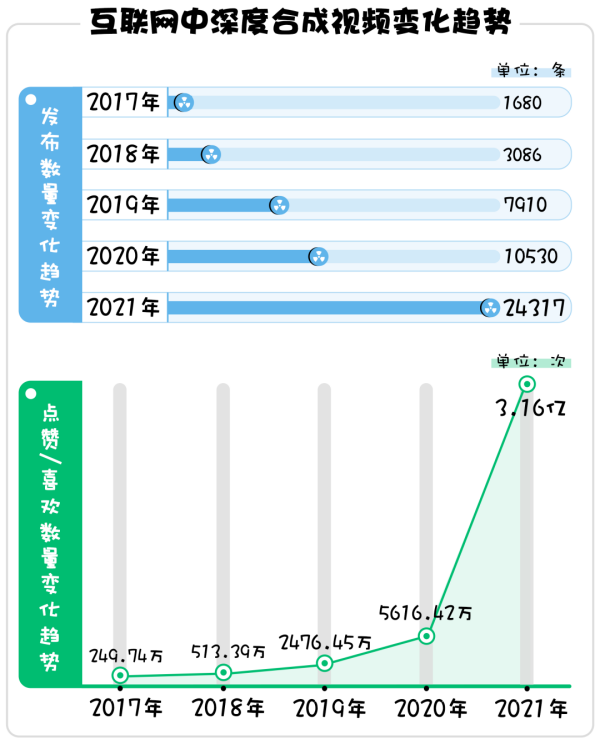 上一次人們感嘆人工智能的強大,還要追溯到2016年,阿爾法圍棋(AlphaGo)成為了第一個擊敗圍棋世界冠軍的人工智能機器人,深度學習的威力開始顯現(xiàn)。在此后的幾年,深度合成技術被廣泛應用于各個領域。以互聯(lián)網(wǎng)中深度合成視頻為例,根據(jù)清華大學人工智能研究院聯(lián)合多家單位發(fā)布的《深度合成十大趨勢報告(2022)》顯示,近幾年,互聯(lián)網(wǎng)中深度合成視頻的發(fā)布與傳播數(shù)量呈現(xiàn)高速增長的態(tài)勢。