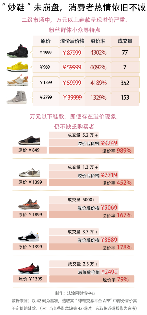 近年來,有關(guān)“炒鞋”的話題熱度不斷,一雙原本幾百塊的球鞋,可能迅速被炒至幾倍甚至幾十倍,造成這種大幅度溢價(jià)的原因在于鞋款的話題性、曝光度、稀有程度等。因“炒鞋”能夠獲取巨大利益,致使市場中出現(xiàn)了“炒鞋”黑產(chǎn)鏈條,同時(shí)也引發(fā)了輿論對(duì)“炒鞋”是否合法、溢價(jià)是否合理等話題的關(guān)注。