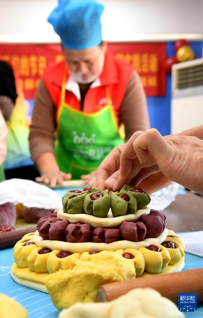 1月15日,在山東省青島市市南區(qū)湛山街道仰口路社區(qū),居民在制作棗餑餑。