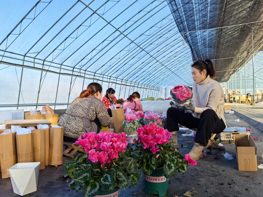 濰坊青州花農(nóng)李有昊的大棚內(nèi),員工正在給網(wǎng)銷花卉打包。新華社記者葉婧 攝