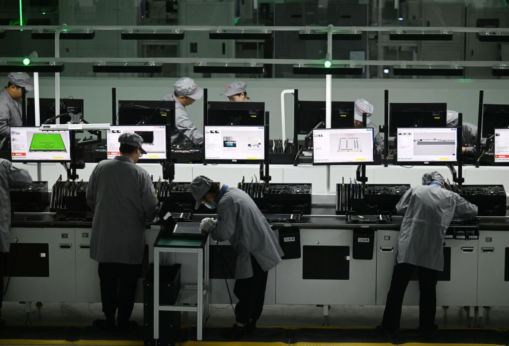 2023年11月6日,工作人員在聯(lián)想集團(tuán)創(chuàng)新產(chǎn)業(yè)園(天津)筆記本生產(chǎn)線作業(yè)。新華社記者 趙子碩 攝