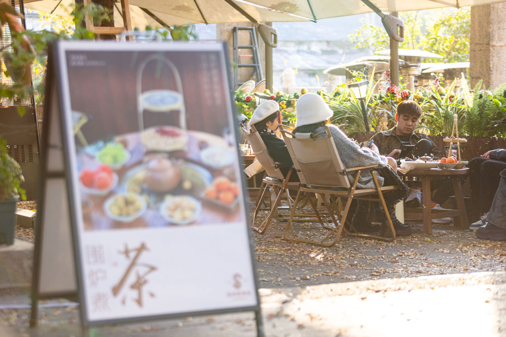 2023年11月25日,在浙江省湖州市吳興區(qū)龍泉街道田盛街,游客在一家飲品店圍爐煮茶。新華社發(fā)(伊凡 攝)