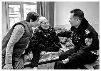 圖為民警王剛來到95歲的魏大娘家中進行春節(jié)慰問,并提供便民服務(wù)。