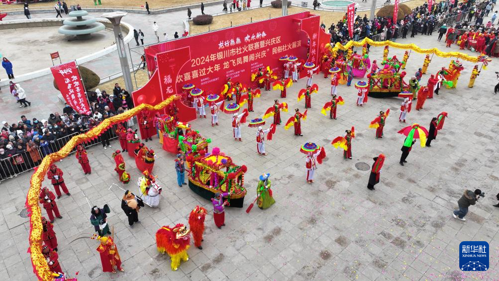 2月20日,在寧夏銀川市,參賽社火隊的演員為市民表演傳統(tǒng)社火項目(無人機(jī)照片)。